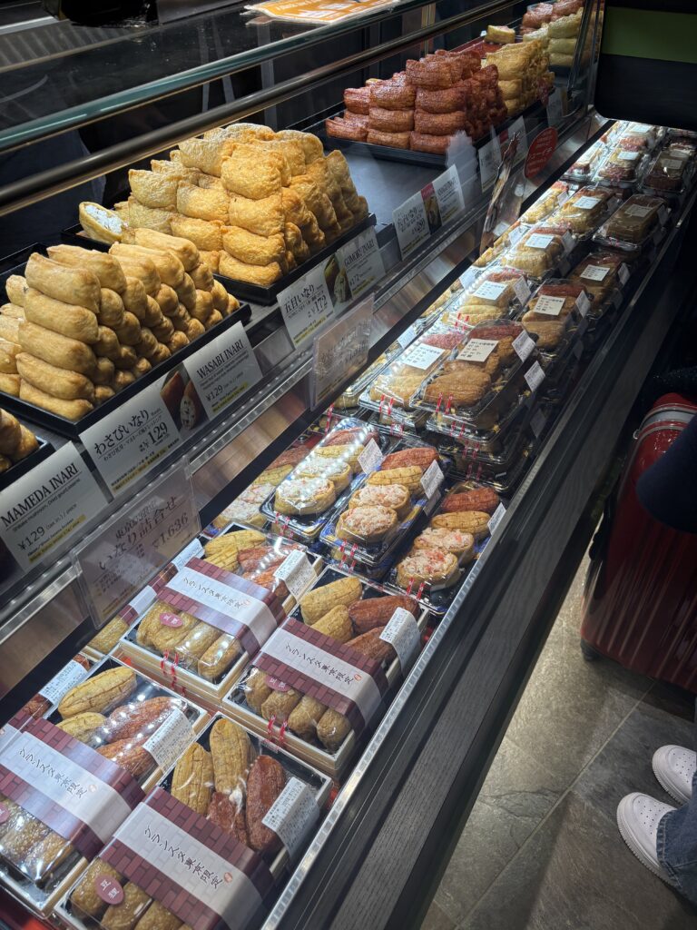 今回もまさにそれで、改札近くの一角にずらりと並んだ、いなり寿司のショーケースに吸い寄せられました。黄金色に艶のあるお揚げ、整然と積み上げられた姿は、派手さはないのに圧倒的な存在感があります。