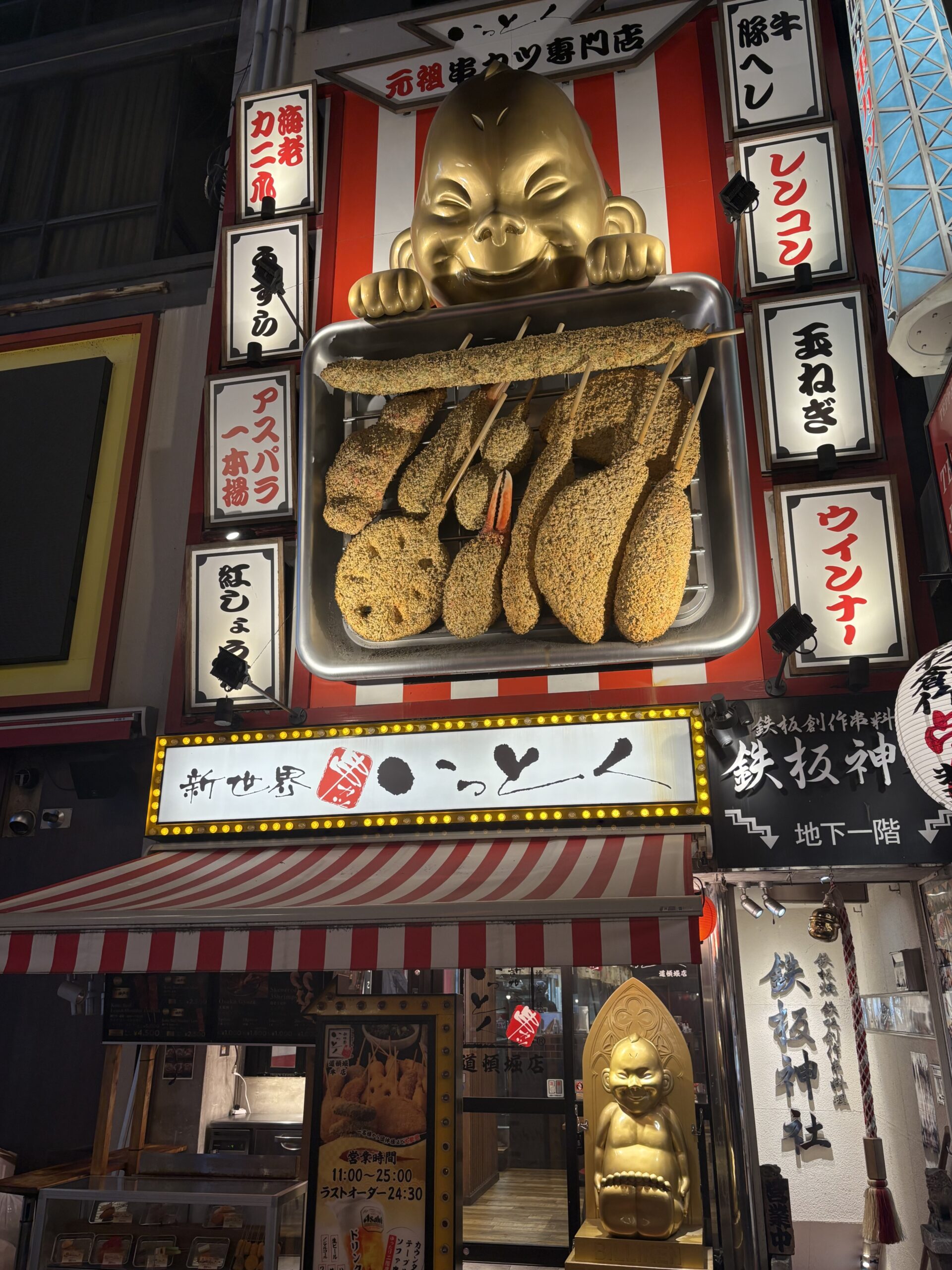 金色のビリケンさんと、ずらりと並ぶ串カツのオブジェが目に飛び込んでくるのが、串カツだるま 心斎橋店です。大阪を代表する串カツ文化を、これ以上ないほど分かりやすく体現した外観は、観光客だけでなく地元の人にも強く印象に残ります。
