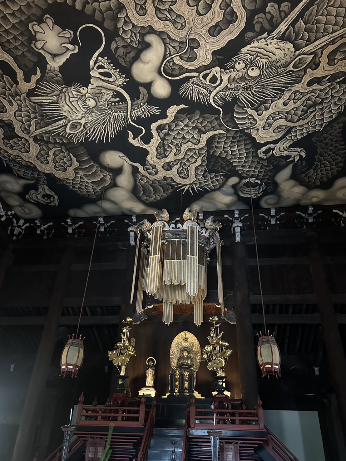 中央には本尊が静かに座し、天井の龍がその上を守るように巡る構図。視線を上げると、龍と目が合うような感覚に包まれます。