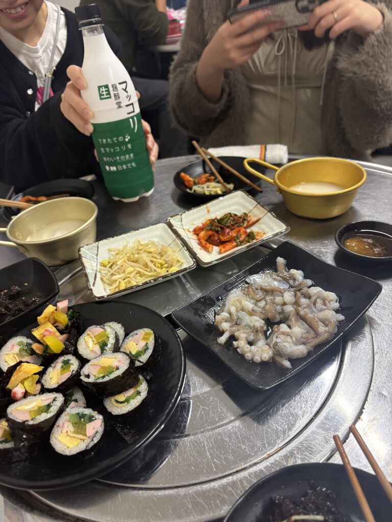 鶴橋を歩くと、焼けた肉の香りやキムチの発酵した匂いが混ざり合い、自然と食欲が刺激される。その中で立ち寄ったのが、地元感の強い韓国食堂。テーブルに並ぶのはキンパ、ナムル、チャンジャ、生タコ、そしてマッコリ。どれも派手さはないが、味ははっきりしていて、口に入れた瞬間に「鶴橋らしさ」を感じる。